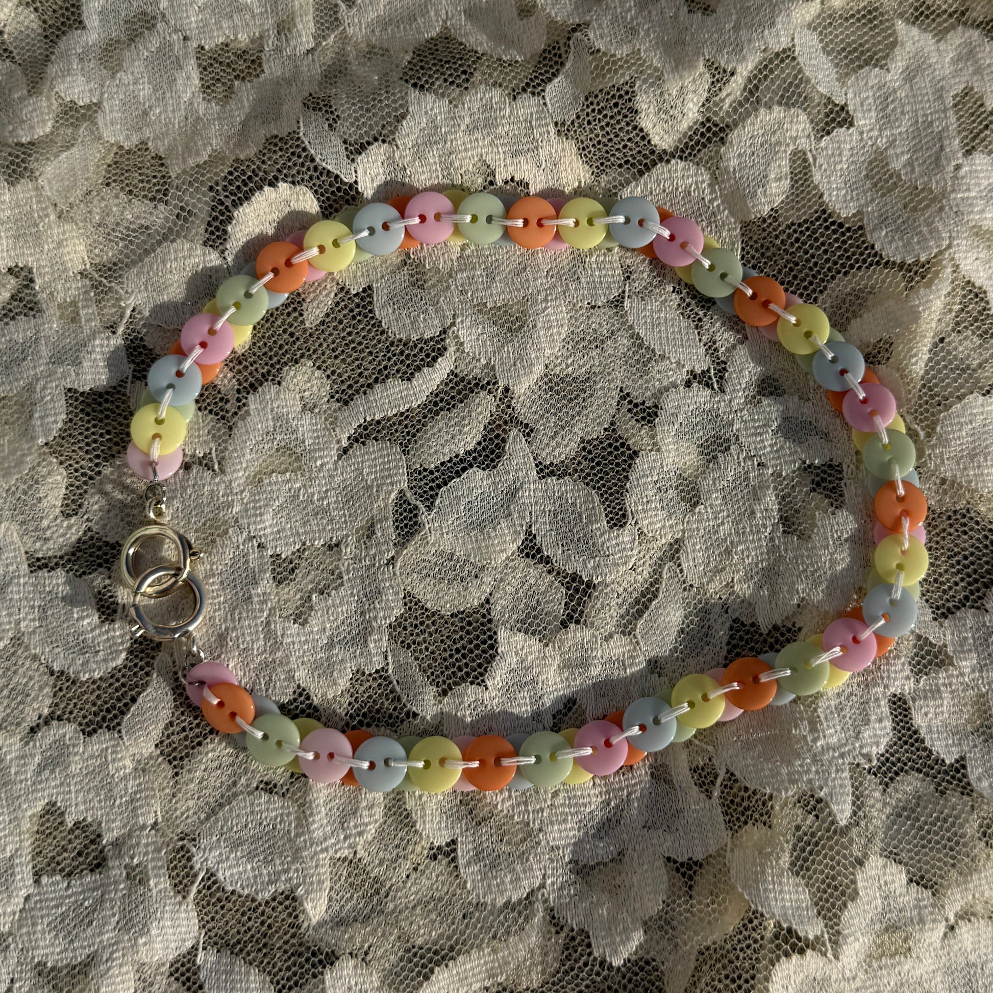 Inspired by a real candy necklace worn casually, the Candy Button necklace is made from candy-colored buttons stitched together and attached to a clasp, and is made to order.